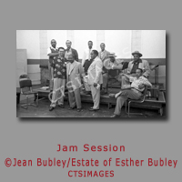 In 1952, Esther Bubley was in Los Angeles on assignment for Ladies’ Home Journal, and her friend, illustrator and artist, David Stone Martin, was also in Los Angeles to attend Norman Granz studio recordings in which he was hired to produce album cover art. Martin invited Bubley to join him. So by chance, Bubley ended up photographing what would later become the famous Charlie Parker / Norman Granz Jam Sessions. Martin created a collage of her images which he used as the basis for his sketches. Some of Bubley’s images were used in the liner notes over the years, but others were unpublished until their re-discovery in the mid 1990’s and subsequently published in France by Editions Filipacchi in 1995 entitled “Charlie Parker-The Norman Granz Jam Sessions”.